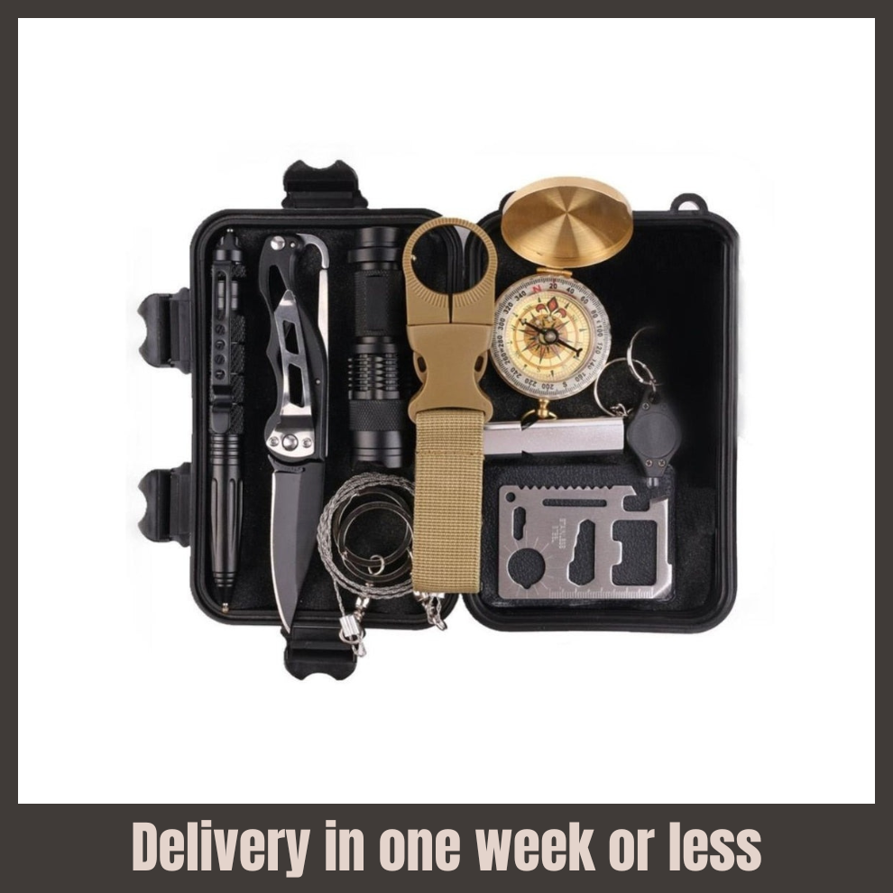 - Versatile Tools: Includes a flashlight, handy Firestarter, wire saw, multi-functional saber card, Survival bracelet, emergency blanket, Fishing Equipment, Carabiner, Tactical Pen, and Multifunctional Card.