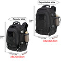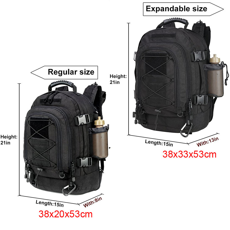 - MOLLE System Integration: Elevate your storage capabilities with the integrated MOLLE webbing system. Attach extra pouches or gear directly to the backpack's front, optimizing storage and ensuring quick access. Additionally, adjustable straps at the bottom further enhance capacity, allowing for the secure attachment of items such as tents or sleeping bags.